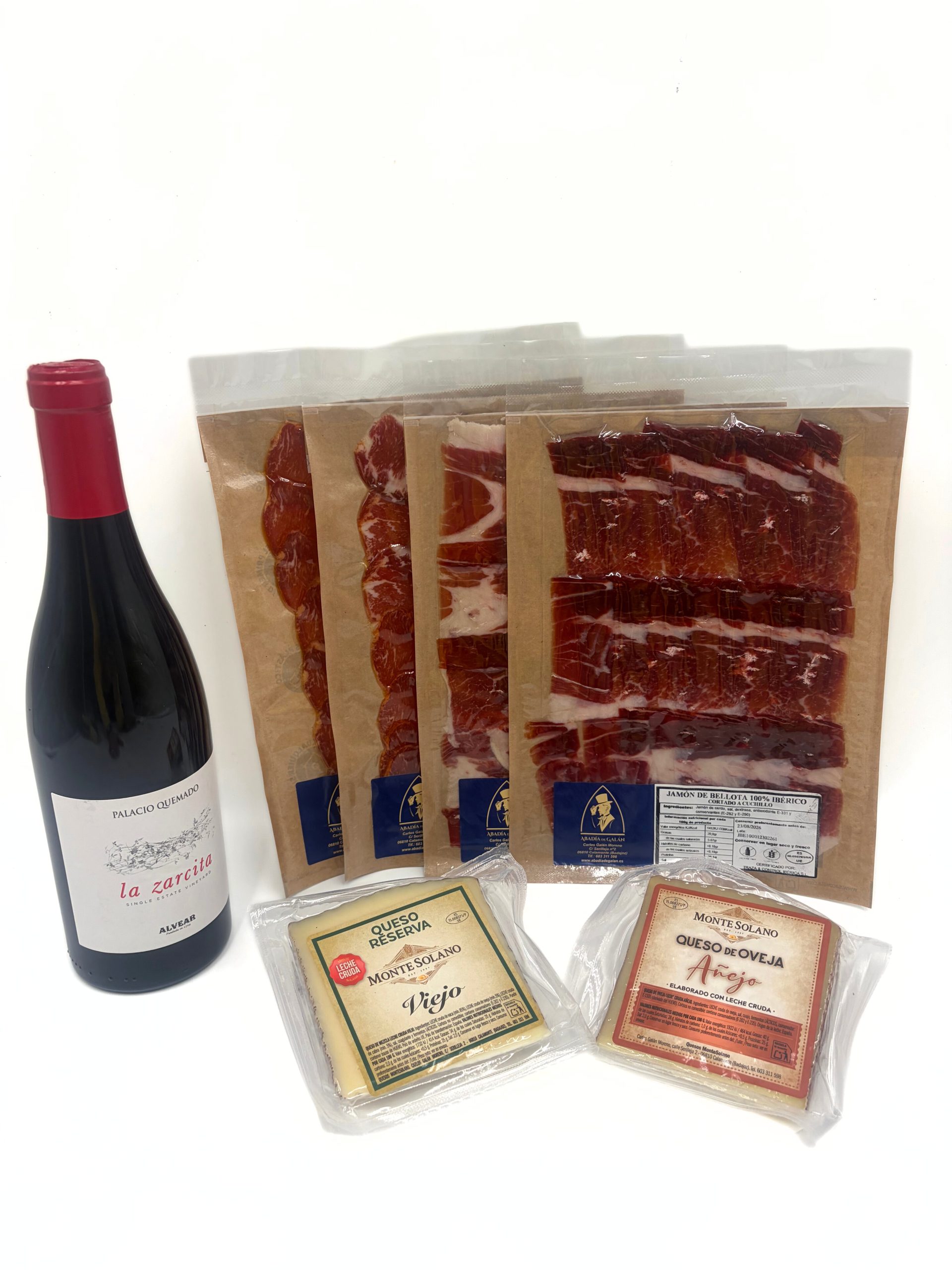 Disfruta de un regalo gourmet pensado para los amantes del auténtico sabor de siempre y los productos artesanos del campo extremeño. Incluye 2 sobres de Loncheado de Jamón de Bellota 100% Ibérico Abadía de Galán cortado a cuchillo, 2 sobres de loncheado de  Lomo de Bellota 100% Ibérico, 1 cuña de Queso de mezcla reserva viejo  MONTESOLANO , 1 cuña de Queso de oveja añejo MONTESOLANO y una botella de vino Palacio Quemado La Zarzita 2021 .