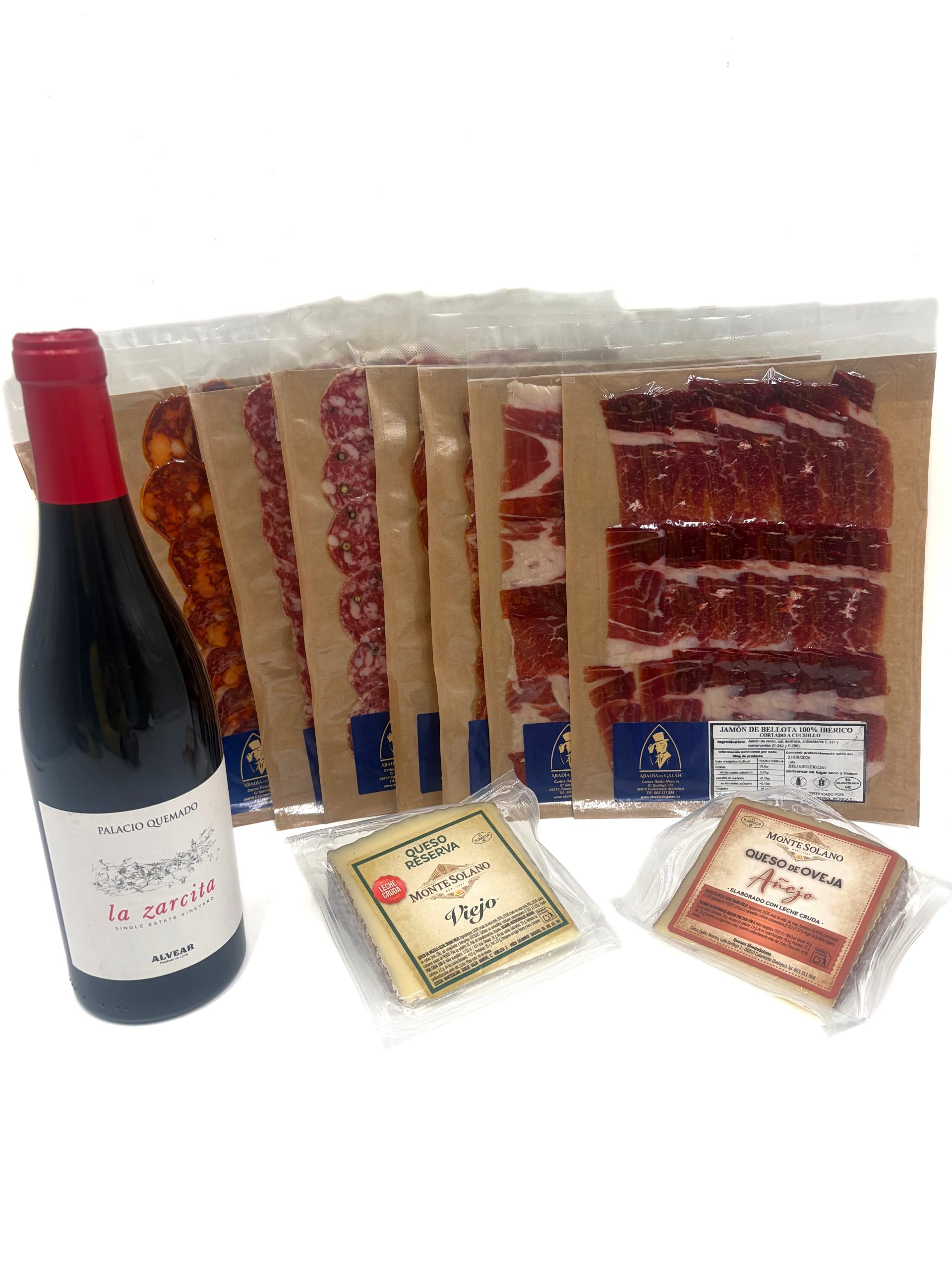 Disfruta de un regalo gourmet pensado para los amantes del auténtico sabor de siempre y los productos artesanos del campo extremeño. Incluye 2 sobres de Loncheado de Jamón de Bellota 100% Ibérico Abadía de Galán cortado a cuchillo, 2 sobres de loncheado de Lomo de Bellota 100% Ibérico, 1 sobre loncheado de salchichón ibérico cular de bellota, 1 sobre de loncheado de chorizo ibérico cular de bellota, 1 cuña de Queso de mezcla reserva viejo MONTESOLANO , 1 cuña de Queso de oveja añejo MONTESOLANO y una botella de vino Palacio Quemado La Zarzita 2021 .