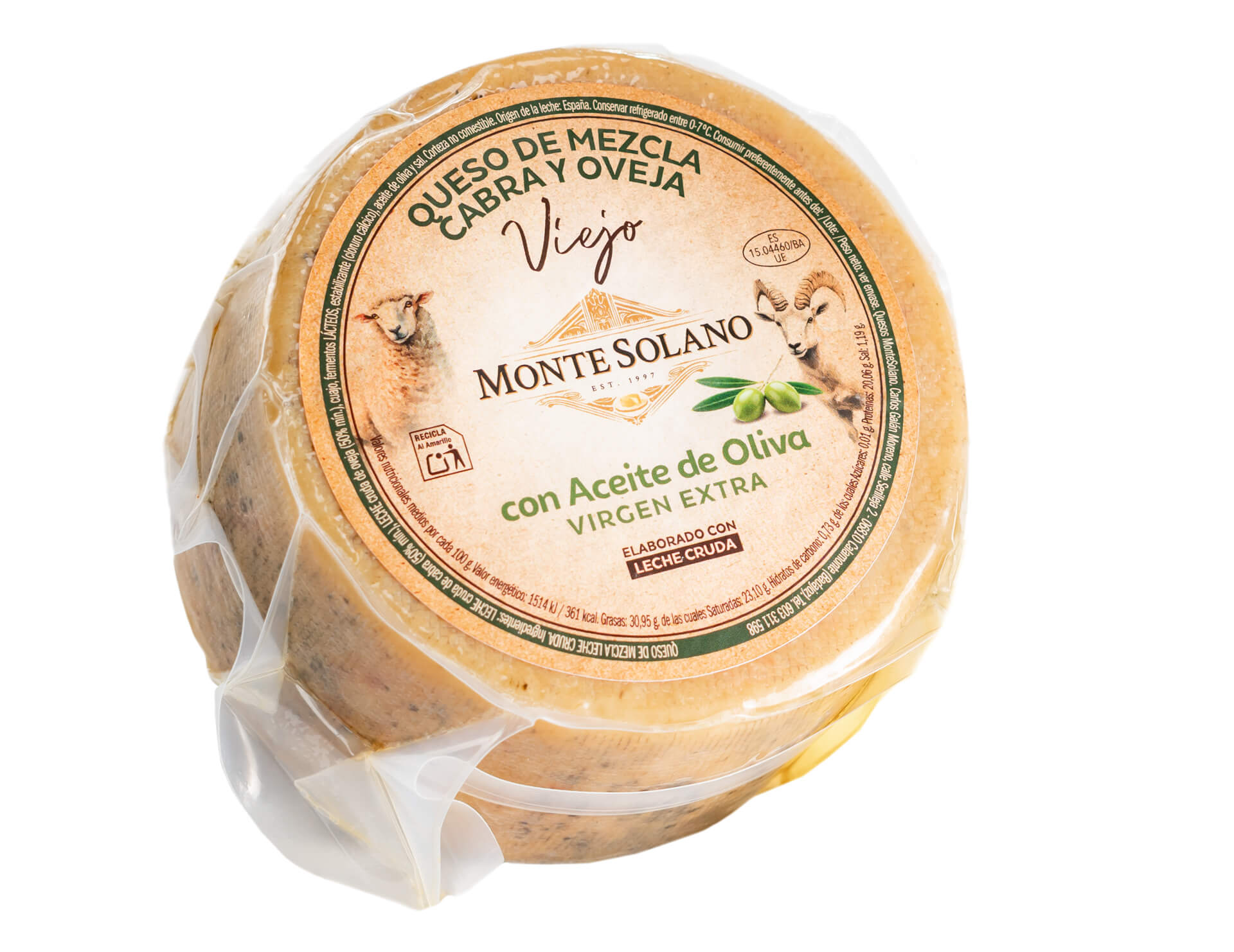 El Queso mezcla MONTESOLANO está elaborado con leche cruda de oveja (50%) y cabra (50 %) con una curación mínima de 180 días en aceite de oliva virgen extra.