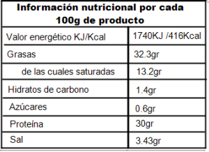 Magro y grasa de cerdo ibérico, sal, dextrina, especias, azúcar, dextrosa, aroma natural, antioxidantes (E-301 E-331iii) emulgentes (E-450iii, E-451i, E-452ii) conservantes (E-250 E-252) y colorante ( E-120)